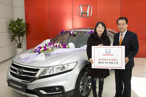 5만 번째 고객 탄생을 기념하는 이날 행사는 최근 오픈한 혼다코리아 수원 광교 전시장에서 이루어졌다. 크로스투어 구입을 통해 5만 번째 고객이 된 행운의 주인공 선우인숙 씨(42세)에게 100만원 상당의 상품과 함께 특별 선물을 증정했다.