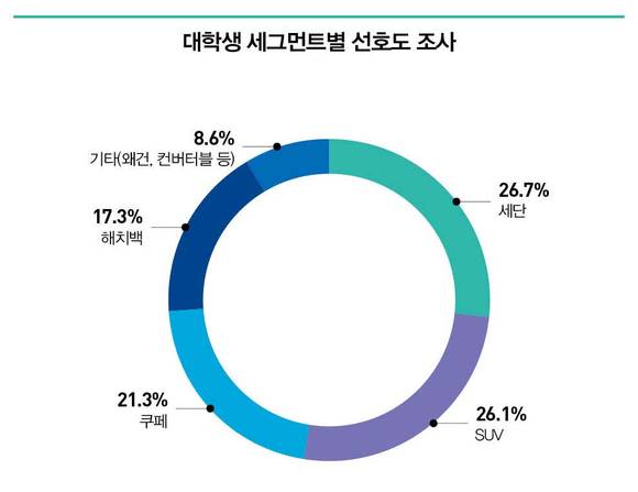 전체 순위는 세단(26.7%), SUV(26.1%), 쿠페(21.3%), 해치백(17.3%) 순으로 나타났다.