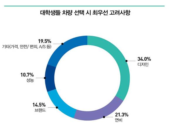 차량 선택 시 가장 우선적으로 고려하는 사항을 묻는 질문에는 남녀 모두 디자인(34%), 연비(21.3%), 브랜드(14.5%) 순으로 일치했으며, 특히 여학생들이 디자인을 우선적으로 고려하는 비중(41%)이 상대적으로 높은 것으로 나타났다.