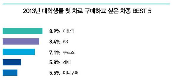 또 첫차로 구매하고 싶은 차량은 작년에 이어 ‘현대 아반떼’인 것으로 조사되었으며 K3/크루즈/레이/BMW미니 등이 뒤를 이었다.