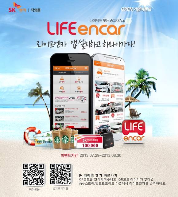 국내 최대 중고차 전문기업 SK엔카(대표: 박성철)는 중고차를 구입하려는 소비자들에게 맞춤서비스를 제공하는 ‘라이프엔카’ 어플리케이션을 출시하고, 이를 기념해 8월 30일까지 다양한 이벤트를 실시한다고 29일 밝혔다.