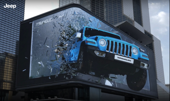 삼성동 코엑스 K-POP 스퀘어 미디어에 한 달간 전시된 랭글러 4xe 아나몰픽 미디어아트 옥외 광고는 극대화된 입체감을 통해 영상 내 효과 요소인 물과 돌이 화면 밖으로 튈 것 같은 착각을 불러 일으켰다.