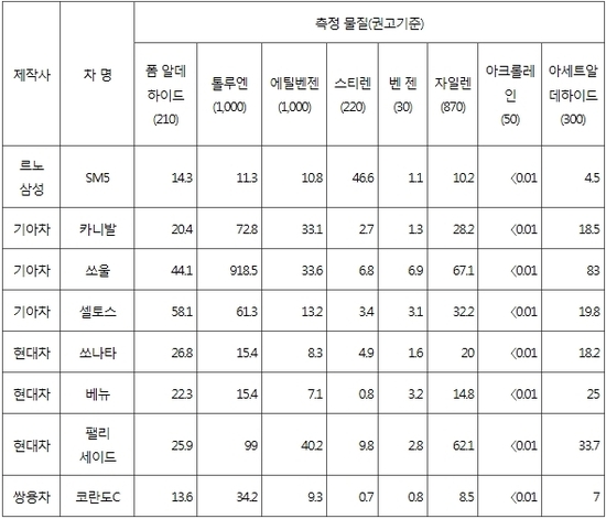 측정 대상 차종은 기아차의 카니발·쏘울·셀토스, 현대차의 쏘나타·팰리세이드·베뉴, 르노삼성의 SM5, 쌍용차의 코란도C 등이다.