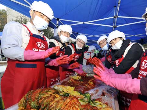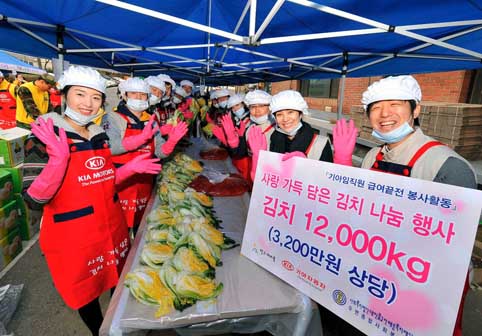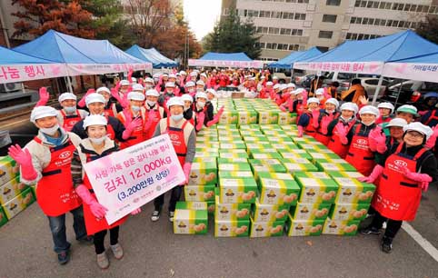 기아차는 기아차를 사랑하는 고객들의 마음을 담아 지역사회 소외 계층이 보다 따뜻한 겨울을 날 수 있도록 하기 위해 이번 나눔 활동을 마련했다고 밝혔다. 이날 기아차 본사 임직원과 지역 어머니회 등 자원봉사자 90여 명은 서울시 서초구소재 우면종합사회복지관에서 사랑의 김장 담그기에 참여하고 1,200여 세대 지역 소외계층 가정에 김장김치 4,000여 포기를 직접 배달하는 시간을 가졌다. 기아차 본사 임직원들은 지난해에 이어 ‘급여 끝전 모으기’를 통해 누적된 기부금으로 이번 김장김치를 마련해 의미를 더했다. 특히, 기아차는 이번 사랑의 김장 나눔 행사를 위해 1사 1촌 결연지역인 강원도 횡성군에서 생산된 배추 8,000kg을 구매하는 등 농촌지역까지 지원하는 일석이조의 사랑 나눔 활동을 펼쳤다. |