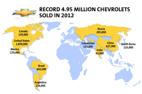 쉐보레의 지난해 전체 판매실적 495만대는 GM이 2012년 한 해 동안 판매한 929만대 중 53%를 차지하며. 이러한 쉐보레의 판매 선전에 힘입어 GM은 2011년 실적(902만대) 대비 지난해 2.9% 판매가 늘었다.