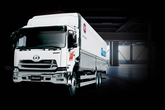 UD트럭의 Quon 6x4 카고트럭은 탁월한 성능과 고연비를 겸비한 직렬 6기통 GH11엔진의 탑재로 높은 출력과 연료 소비를 최소화한 15톤급 트럭이다.