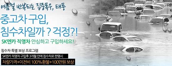 국내 최대 중고차 전문기업 SK엔카(대표: 박성철)는 여름철 중고차 구입 시 침수차를 걱정하는 소비자들을 위해 오는 10월 31일까지 ‘침수차 특별 보상 프로그램’을 실시한다고 24일 밝혔다.