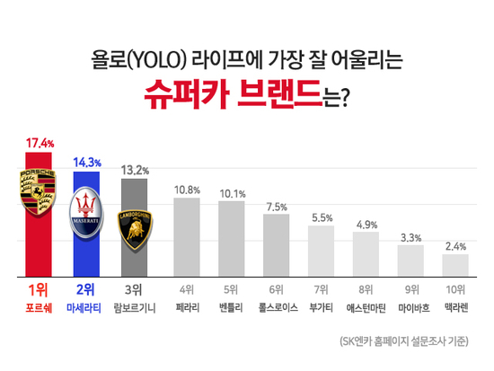 SK엔카닷컴은 자사 홈페이지를 통해 욜로(YOLO; You Only Live Once) ) 라이프와 가장 잘 어울리는 슈퍼카 브랜드를 조사한 결과 포르쉐가 1위에 선정되었다고 10일 밝혔다.