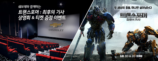 함께 진행되는 모바일 영화관람권 증정 행사는 쉐보레 홈페이지를 통해 응모하는 고객 1만명에게 인당 2매씩 트랜스포머: 최후의 기사 무료 관람권을 제공한다.