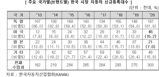반면 미국계 브랜드의 판매량은 한미 FTA에 따른 승용차 관세 철폐로 가격경쟁력이 높아지며 2017년부터 4년 연속 증가해 왔다.