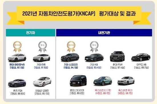 국토교통부는 한국교통안전공단 자동차안전연구원과 11개 신차(전기차 4종·내연기관차 7종)를 대상으로 '2021년 자동차안전도평가(KNCAP)'를 시행한 결과 아이오닉5가 종합점수(100점 만점) 92.1점, 스포티지가 94.1점으로 최우수차에 선정됐다고 21일 밝혔다.