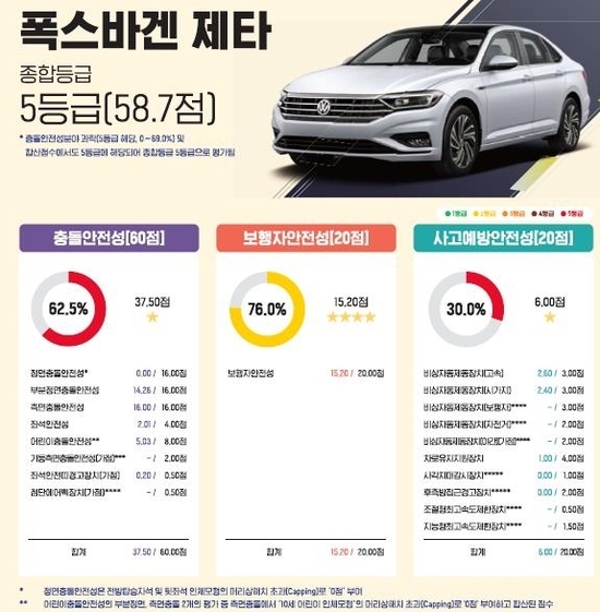 제타는 고정벽 정면충돌에서 동승자석 머리, 뒷좌석 머리·흉부 상해 기준값 상한선을 초과했다. 다른 차종과 비교해 첨단 안전장치도 장착되지 않아 사고 예방 안전성 등급도 낮게 나왔다.