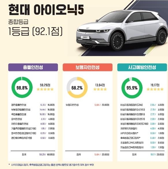 아이오닉 5와 EV6는 충돌 안전성과 사고 예방 안전성 항목에서 우수한 점수와 등급을 획득했다. 보행자 안전성 항목에서는 아이오닉 5가 양호 수준 등급을, EV6가 보통 수준 등급을 기록했다.