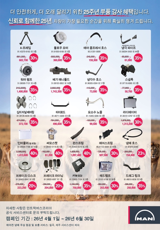독일 프리미엄 상용차 브랜드 만트럭버스그룹의 한국법인 만트럭버스코리아(이하 만트럭)는 창립 25주년을 맞아 ‘만트럭버스코리아 25주년 부품 캠페인’을 진행한다.