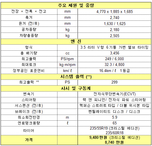공인연비(16.4km/L) 와 CO₂배출량(142g/km)을 기존 RX400h 대비 약 28%를 줄임으로써 1등급 연비를 실현했다. 한편 뉴RX450h에는 신형 RX350에 장착된 최신 장비 외에도 전자 제어식 에어 서스펜션을 추가하였는데(크리스털 에디션 기준), 주행상황에 따라 최적의 차고를 유지할 수 있도록 해주어 승차감과 함께 주행 안정성을 향상시켰다. 또한, EV(Electric Vehicle)모드가 추가되어 시속 40km/h이하로 주행 시 1 km 정도의 거리를 연료소모 없이 전기모터로만 주행이 가능하다. ☞판매가격은 부가세 포함하여 8,740 만원. 9,480만원 (크리스털 에디션)이다. |