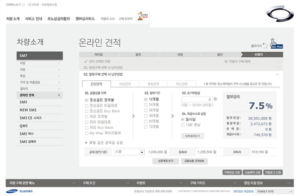 르노삼성자동차는 공식 홈페이지(www.renaultsamsungm.com)의 차량 견적시스템을 이용해 영업지점을 방문 하지 않아도 지점을 방문해 받아본 견적과 동일한 수준의 견적을 고객이 편한 곳에서 직접 확인 할 수 있도록 했다. 공식 홈페이지를 통한 온라인 차량 견적시스템은 기존에도 운영을 하고 있었지만, 고객들이 확인 할 수 있는 정보에는 한계가 있었다. 하지만, 르노삼성자동차는 이번 차량 견적시스템의 개선을 통해 국내 자동차 회사로는 최초로 단순히 차량의 금액을 확인하는 수준을 넘어 매달 변경되는 다양한 할부상품을 포함한 비교견적, 리스견적, 추천견적 등 여러 판매조건들을 고객이 직접 적용하여 여러 가지 구입방법을 확인해 볼수 있도록했다. 2000년 9월 출범 시부터 ‘원 프라이스’ 정책을 내세우며 국내 자동차 업계에 획기적인 영업방식을 전개해 새로운 바람을 일으켜 온 르노삼성자동차는 이번 차량 견적시스템 개선을 통해 또 한번의 선도적인 역할을 했다는 업계 관계자들의 반응이다. 르노삼성자동차 영업본부장 박수홍 전무는 “르노삼성자동차는 항상 고객들의 입장에서 생각하며 영업활동을 전개해왔다. ‘원 프라이스’ 정책이 그러했으며, 이번 차량 견적시스템 개선 또한 그런 맥락이다”며 “앞으로도 영업활동 전반에서 고객들이 쉽고 편하게 르노삼성자동차의 제품을 접할 수 있도록 항상 고민하고 개선활동을 지속적으로 전개 할 예정이다”라고 밝혔다. |