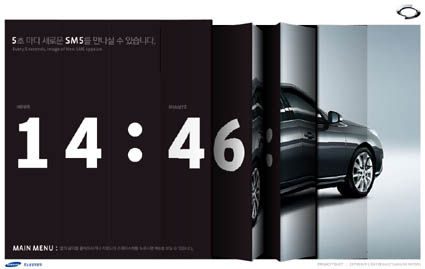 웹사이트’는 "뉴 SM5"의 제품설명과 스크린 세이버 및 모바일 어플리케이션을 다운 받을 수 있는 다운로드 메뉴 그리고 진행중인 "뉴 SM5"의 이벤트 및 당첨자를 확인할 수 있는 이벤트 메뉴로 구성되어있다. 또한, 이벤트 메뉴에서는 항상 시대를 앞서가는 첨단 장치와 안전 사양으로 중형 자동차 시장의 트랜드를 이끌어온 SM5의 10년 역사를 인트로 무비를 통해 만나볼 수 있다. |
