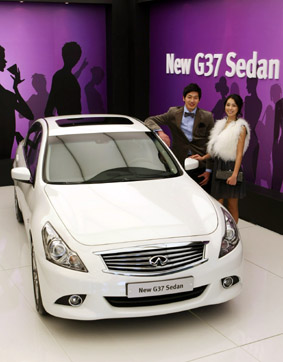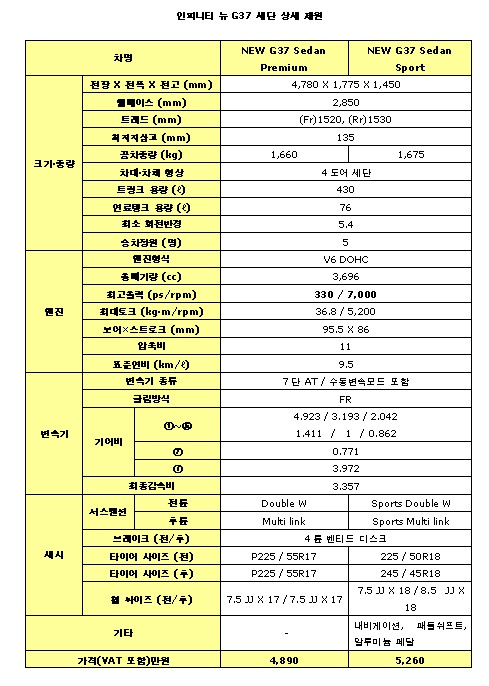 프리미엄과 스포츠 두 가지 모델의 뉴 G37세단은 기존 대비 30만~100만원 인하한 ▲4,890만원(프리미엄, 100만원 인하), ▲5,260만원(스포츠, 30만원 인하)으로 가격을 확정했다. 글로벌 럭셔리 브랜드 인피니티(한국닛산)는 16일, 인피니티 강남전시장(SS 모터스)에서 럭셔리 스포츠 세단 ‘뉴 G37 세단’의 신차발표회를 갖고 공식 판매를 시작했다고 밝혔다. 뉴 G37 세단 국내 판매는 북미보다 하루(북미, 2010년 12월 17일 시판 예정, 현지시간) 빨리 시작했다. 뉴 G37세단은 실내외 디자인을 대폭 변경해, 새로운 G37 세단으로 변신했다. 새로운 디자인의 더블 아치형 그릴과 일체감을 주는 하단 그릴, 볼륨감을 높인 프런트 범퍼, 헤드 램프 라인 및 안개등에 크롬 장식을 추가하는 등 프런트 디자인을 최근 트렌드에 맞추어 설계됐다. 계기판은 기존 붉은색 대신 흰색조명을 탑재해 시인성을 높였다. 센터콘솔부터 암레스트까지 유려하게 흐르는 듯한 디자인에 볼륨감을 높인 기어 노브 주변부와 센터페시아, 도어 인테리어에 물결무늬가 적용된 알루미늄 트림 등을 적용해 수준 높은 인테리어 감성 품질을 자랑한다. |