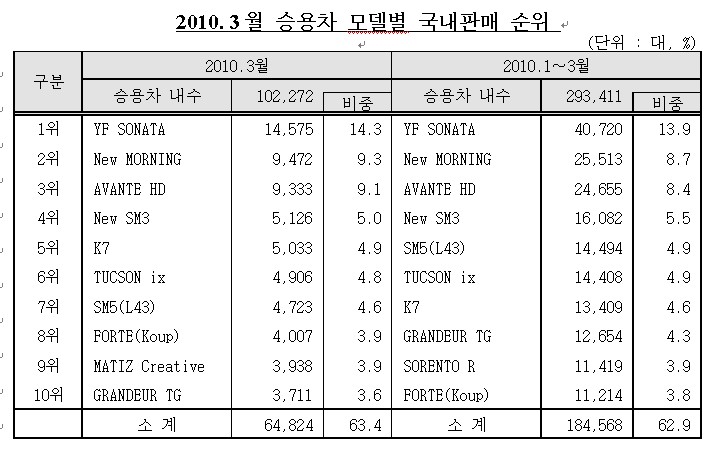 1~3월 모델별 판매순위는 YF쏘나타가 1위를 차지했으며, 다음으로 뉴모닝이 2위, 아반떼HD가 3위, New SM3가 4위, New SM5가 5위, 투싼ix 6위, K7이 7위를 나타냈다. 랭킹 10위권에는 ▲현대(YF쏘나타, 아반떼HD, 투싼ix, 그랜저TG), ▲기아(뉴모닝, K7, 쏘렌토R, 포르테)가 각각 4개 모델, ▲르노삼성(New SM3, New SM5)이 2개 모델을 차지했다. |
