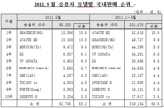 한국자동차공업협회에 따르면 5월 승용차 모델별 내수판매 순위는 신차 그랜저(HG)가 10,396대 판매되어 4개월 연속 1만대 이상 판매를 기록하면서 2개월 연속 1위를 차지했다. 이어 현대 아반떼(MD)가 10,169대 판매되어 2위를 차지했고, 기아 모닝(TA)은 고유가와 신차효과로 인기를 끌면서 9,472대가 판매되어 3위를 기록했다. 중형부문에서 치열한 경쟁을 벌이고 있는 K5, YF쏘나타가 그 뒤를 이었으며, 지난 4월 6위를 차지했던 스포티지R은 유성기업 사태로 인한 공급차질로 순위권 밖(11위)으로 밀려났다. |