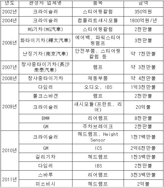특히 공개 입찰에서 일본 최고의 글로벌 램프 회사들을 제쳐 현대모비스의 램프 경쟁력이 세계 수준에 도달했음을 입증했다. 현대모비스의 램프사업 시작 4년만의 쾌거이다. 이번 수주는 또 국내 자동차 부품 업체의 해외 수주 방식에 본격적인 변화를 예고하고 있다. 지금까지는 국내 완성차 업체에 먼저 공급하여 기술과 품질에서 시장의 충분한 검증을 받은 제품에 대해 해외 완성차 업체의 수주가 가능했으나, 현대모비스의 LED 헤드램프는 아직 국내에서 적용된 차종이 없는 상태에서 해외 수주에 성공했기 때문이다. 현대모비스가 국내 완성차 업체 공급 전에 해외 수주에 성공한 것은 지난 2009년부터 다임러 벤츠의 거의 전 차종에 적용하고 있는 지능형 배터리 센서(IBS)와 올해 초부터 크라이슬러에 공급하는 어댑티브 헤드램프(AFLS)에 이어 세 번째다. 현대모비스 해외사업본부 이준형 부사장은 “작년에 미쓰비시를 방문하여 ‘Mobis Tech Fair’를 열고, 미쓰비시가 현대모비스 연구소와 공장을 방문하여 기술과 품질, 생산능력 등에 대해 호평했다”면서 “올해 수출 목표 15억2천만 달러를 달성하는 한편 현재 매출대비 10%의 해외수출 비중을 2015년까지 30%로 늘려나가겠다”고 밝혔다. ※현대모비스 해외 완성차업체 주요 수주현황 |
