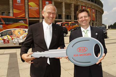 기아차는 26일(일)부터 7월 17일(일)까지 독일 베를린, 프랑크푸르트 등 9개 도시에서 열리는 ‘2011 FIFA 독일 여자 월드컵’ 기간 동안 ▲대회 공식 차량 지원 ▲기아 마스코트 프렌드 ▲기아 로드쇼 등 다양한 마케팅을 통해 성공적인 대회 운영을 돕는 한편 유럽 지역에 기아차 브랜드 알리기에 적극 나선다. ■ 대회 공식 차량 전달식 기아차는 16일(현지시간) 독일 베를린 올림픽 스타디움에서 마틴 반 부트 기아차 독일판매법인 사장을 비롯한 기아차 관계자와 게르트 그라우스 대회 조직위원회 이사 등 대회 관계자들이 참석한 가운데 ‘2011 FIFA 독일 여자 월드컵’ 대회 공식 차량 전달식을 가졌다. 이날 행사에서 기아차는 ▲쏘렌토R(현지명 뉴쏘렌토) ▲카렌스 ▲카니발 등 총 60대의 차량을 전달했으며, 전달된 차량들은 주요 VIP 의전, 행사 운영 지원 등으로 사용돼 성공적인 대회 개최를 뒷받침하게 된다. |