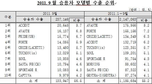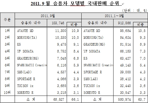 한국자동차공업협회 집계에 따르면 가장 많이 판매된 현대 아반떼(MD)는 기간중 11,300대 판매로 4개월 연속 1위를 차지했다. 신차 모닝(TA)이 고유가와 신차효과로 인기를 끌면서 10,330대가 판매되어 2위를 차지했다. 이어 K5가 3위, YF쏘나타가 하이브리드 차량 판매호조로 그 뒤를 이었으며 5위는 꾸준한 인기를 얻고 있는 그랜저(HG)가 차지했다. 한편 1~9월 모델별 누적 판매순위는 아반떼MD, 모닝TA, 그랜저HG, YF쏘나타, K5, 스파크 순으로 집계됐다. 랭킹 10위권에는 ▲현대(아반떼MD, 그랜저HG, YF쏘나타, 투싼ix)가 4개 모델, ▲기아(모닝TA, K5, 스포티지R, 쏘렌토R)가 4개 모델, ▲한국지엠(스파크), ▲르노삼성(뉴SM5)이 각각 1개 모델 차지했다. |