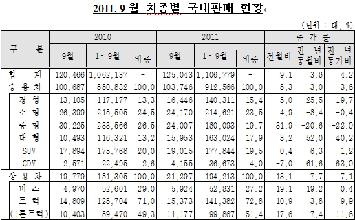 9월 차종별 내수판매는 승용차가 전년동월비 3.0% 증가한 103,746대에 달했으며, 차급별로는 CDV, 대형, 경형, SUV는 증가하였으나 소형 및 중형은 감소했다. ▲CDV는 실용성을 갖춘 올란도 신차효과 등으로 61.6%, ▲대형은 그랜저, 뉴SM7이 호조를 보이면서 52.0%의 높은 증가세 기록했다. 고유가 시대를 맞아 차량유지비에 강점이 있는 ▲경형이 25.5% 증가했으며, 또한 쏘나타 하이브리드는 911대, K5 하이브리드는 806대 판매되어 동 모델에서의 판매비중이 각각 10.4%, 8.5%를 기록했다. 상용차는 스타렉스 판매증가 및 트럭의 교체수요 등으로 7.7% 증가한 21,297대 기록했다. 한편 1~9월 내수판매는 승용차 3.6%, 상용차 7.1% 증가했다. 승용차 차급별로는 신차들이 판매호조를 보이고 있는 CDV(63.0%), 대형(40.2%), 경형(19.7%)이 두 자리수의 높은 증가세를 기록했다. 상용차는 수출입 물동량 및 산업수요 증가, 교체수요 등으로 트럭이 높은 증가세를 유지했다. |