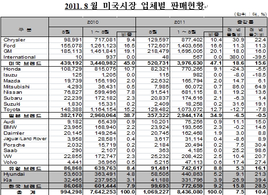 지난 8월 미국 자동차판매는 신용등급하락에 따른 소비심리 위축에도 불구하고 대기수요 유입 지속 및 유가 안정화로 전년동월비 7.5% 증가한 1,069,227대 기록했다. 업체별로는 크라이슬러(30.9%), GM(18.0%), 현대•기아차(15.8%) 등 주요업체 대부분이 증가세를 보였으나, 도요타(-12.7%), 혼다(-24.3%) 등 일본업체는 대지진 여파에 따른 재고부족으로 감소세를 보였다. 1~8월 미국시장 자동차판매는 전년동기비10.4% 증가한 가운데, 한국차는 주요모델(쏘나타, 엘란트라, 싼타페, 쏘렌토 등) 판매호조 지속 및 일본 경쟁업체의 판매부진으로 28.5% 증가한 772,659대 기록했다. 시장점유율: ▲미국차 47.1%(전년동기비2.1%p 상승), ▲일본차34.9%(-3.8%p 하락), ▲한국차9.2%(1.3%p 상승), ▲유럽차8.8%(0.4%p 상승) |