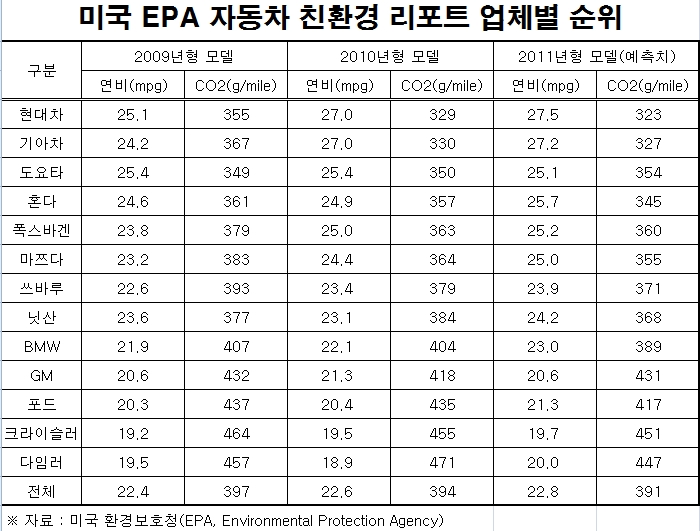 | 현대·기아차가 미국에서 도요타, 혼다 등 전통적인 고연비 자동차 업체를 제치고 최우수 친환경 브랜드에 올랐다. 현대·기아자동차(회장 정몽구)는 7일(현지시간) 미국 환경보호청이 발표한 ‘자동차 기술, 이산화탄소 배출, 연비 동향 보고서’에서 현대·기아차가 2010년형 모델 기준 기업평균연비 및 이산화탄소 배출 부문에서 최우수 브랜드로 선정됐다고 밝혔다. 미국 환경보호청은 매년 각 자동차업체의 모델에 대한 연비 및 이산화탄소 배출량을 조사, 분석해 미국 자동차 산업의 친환경 동향을 보고서로 발표하고 있다. 특히, 미국 환경보호청은 자동차 연식별로 각 기업별 평균 연비와 이산화탄소 배출량을 조사해 순위를 함께 발표하고 있다. 이번 발표에서 현대차와 기아차는 2010년형 모델 기준으로 27.0mpg(환산기준 11.5km/ℓ)의 기업 평균연비를 기록해 25.4mpg(환산기준 10.8km/ℓ)을 기록한 도요타를 제치고 최고 연비 기업으로 올라섰다. 또한, 이산화탄소 배출량에서도 현대차와 기아차는 각각 329g/mile, 330g/mile을 기록해 350g/mile을 기록한 도요타와 357g/mile을 기록한 혼다 등을 제치고 최우수 친환경 브랜드로 우뚝 섰다. 이와 함께 2011년형 모델의 예상 판매량을 기반으로 한 2011년형 모델 기준 예측치 결과에서도 현대차와 기아차는 각각 27.5mpg(환산기준 11.7km/ℓ, 27.2mpg(환산기준 11.6km/ℓ)의 연비를 기록해 현대·기아차의 연비 경쟁력은 당분간 지속될 것으로 예상되고 있다. 특히, 이번 결과로 현대·기아차는 미국 정부가 점차 환경 규제를 강화하고 있는 가운데 전 세계 자동차 업체들이 가장 치열하게 경쟁하는 미국 자동차 시장에서 친환경 선도 기업으로 부상했다. 나아가 엔진 다운사이징, 경량화, 친환경차 개발 등 현대·기아차가 지속적으로 강화해 나가고 있는 친환경 기술력 강화 노력이 결실을 맺었으며, 또한 세계적으로 인정받는 계기가 됐다. 대·기아차 관계자는 “전 세계적인 고유가로 자동차 업체들이 고연비차에 대한 소비자들의 관심이 어느때보다 높아지고 있다”며, “현대·기아차는 향후에도 친환경차 개발, 엔진 다운사이징, 차체 경량화 등을 통해 지속적으로 연비를 향상시켜 나갈 것”이라고 밝혔다 |