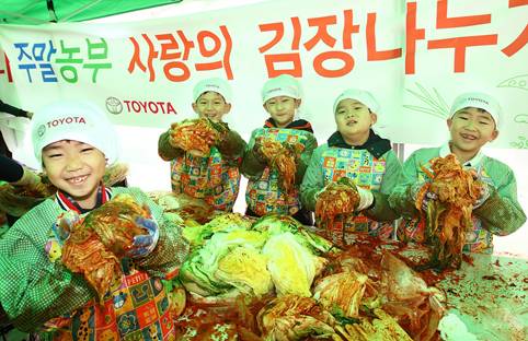 한국토요타자동차는 지난 25일 토요타 주말 농부들이 직접 농사를 지어 수확한 친환경 배추로 직접 김장 김치를 담가 어려운 이웃을 돕는 나눔 행사를 진행했다고 밝혔다.