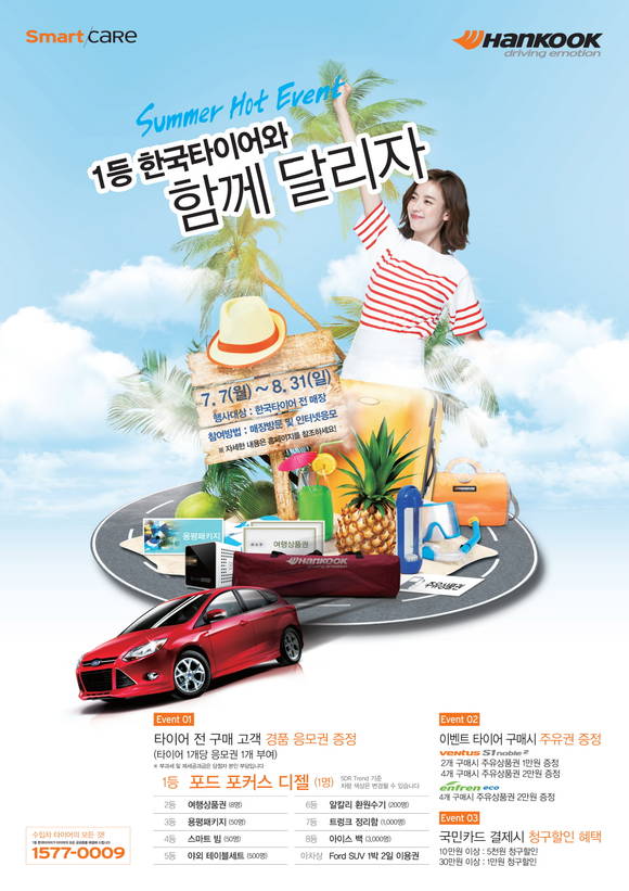 글로벌 선도 타이어 기업 한국타이어(대표: 서승화)가 여름 휴가철을 맞아 ‘썸머 핫 이벤트, 1등 한국타이어와 함께 달리자’를 8월 31일까지 실시한다.