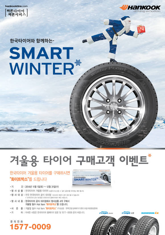 한국타이어는 이번 ‘겨울용 타이어 구매고객 감사 이벤트’를 통해 겨울용 타이어를 4개 이상 구매한 고객을 대상으로 성에 제거기, 차량용 방향제 등 겨울철 차량 필수용품으로 구성된 ‘화이트 박스’를 증정한다.