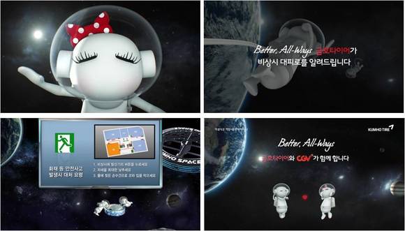 전국 CGV 영화관에 선보이고 있는 금호타이어의 비상대피도 안내광고는 ‘안전’에 대한 주제를 캐릭터를