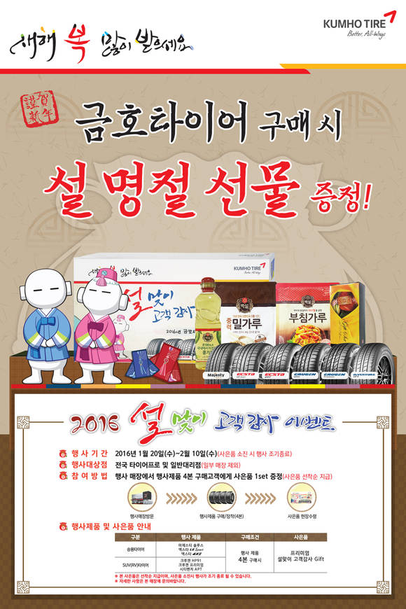 금호타이어(대표: 김창규)가 민족 최대의 명절인 설을 맞아 오는 2월 10일까지 승용/SUV차량용 프리미엄 타이어 구매 고객을 대상으로