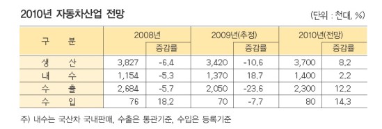 ▶2009년 내수 18.7% 증가, 수출은 23.6% 감소 2009년 내수판매는 글로벌 금융위기에 따른 소비심리 위축과 금융경색으로 4월까지는 15% 이상 감소세를 보였으나 5월부터 증가세로 전환되는 급반전이 나타났다. 그 이유는 승용차 개별소비세 30% 인하조치가 6월 말로 끝나는 데다 5월부터 노후차교체시 개별소비세·취득세·등록세의 70% 감면조치 등 내수부양책에 힘입은 것이다. 업계차원에서는 YF쏘나타, 투싼ix, 쏘렌토R, 마티즈 크리에이티브, 뉴SM3 등 다양한 신차를 내놓으면서 교체수요를 견인했다. 차종별로는 소형승용, SUV가 30% 이상 급증했으며 중소서비스업의 경기회복 기대감으로 1톤트럭도 24% 이상 증가했다. 업체별로는 라인업이 강한 현대차, 기아차와 뉴SM3를 출시한 르노삼성차가 호조를 보였다. 2009년 수출은 최대시장인 미국·서유럽 침체와 일부국가의 금융위기로 23.6%나 감소한 것으로 추정된다. 대미수출은 23% 감소하고 서유럽수출도 29%나 감소했다. 원자재가격하락과 금융위기 피해가 컸던 동유럽과 중남미 수출도 각각 76.7%, 16.3% 감소했다. 해외생산이 1,850천대로 27% 증가한 것도 수출에 영향을 미쳤다. 부품을 포함한 자동차수출액은 28.5% 감소한 350억달러에 그쳤다. ▶2010년 내수판매 2.2% 증가한 1,400천대 전망 2010년은 세계 자동차판매가 회복세로 돌아서면서 최대시장으로서 중국의 부상, GM·토요타의 반격, 전기차 및 저가차 개발경쟁 등이 핵심이슈가 될 전망이다. 내수는 경기회복에도 불구하고 전년수준에 그치겠으나 수출이 신흥국 중심으로 본격 회복되면서 국내생산은 8.2% 증가한 3,700천대, 해외생산은 24.3% 증가한 2,300천대로 한국차의 글로벌 경쟁력이 향상될 전망이다. 2010년 국내경제는 민간소비와 투자가 증가하고 수출개선추세가 유지되어 5%대의 성장이 가능할 전망이다. 지난해 금융경색과 고용불안 등으로 위축되었던 소비심리가 개선되고, 특히 민간의 설비 및 건설투자 회복이 트럭판매에 긍정적인 영향을 줄 것으로 기대된다. 다만 금리상승에 따른 가계부채부담 가중, 원자재가 상승, 원화가치 상승 등이 하반기 회복세를 둔화시킬 전망이다. 시장측면에서 2009년 말 노후차량 교체지원 종료에 따른 선취구매에도 불구하고 잠재대체수요가 꾸준히 증가하고 있다는 점과 10개의 신차가 예정되어 있다는 점이 수요증가에 플러스영향을 줄 것이다. 10년 이상 노후차량은 2008년 말 총등록차의 26.8%인 4,499천대였으나 2009년 10월 말엔 4,917천대로 418천대 늘어났다. 지난해 최대 250만원의 세제지원이 폭발적인 대체수요로 나타난 사실에 비춰볼 때 2010년에도 업계의 판촉전략에 따라 내수가 증가할 여력은 충분하다 하겠다. 더욱이 아반떼, SM5, 스포티지, 그랜저 등의 신차는 시장영향력이 클 전망이다. 현대차 그랜저신형, 기아차 K7, 르노삼성차 SM5, 지엠대우 VS300이 경합하는 중대형급에서 경쟁이 가장 치열할 전망이다. ▶수출은 12.2% 증가한 2,300천대 전망 2010년 자동차수출은 과거 2년 연속 감소에서 탈피해 12.2% 증가한 2,300천대가 예상된다. 주요국의 내수부양책 종료로 수요위축이 우려됨에도 불구하고 수출이 회복될 것으로 보는 이유는 ☞첫째, 세계 자동차수요가 3.9% 증가로 글로벌 침체에서 벗어날 것으로 예상되기 때문이다. 독일, 프랑스, 이탈리아 등 폐차인센티브를 실시했던 서유럽 수요만 3% 감소가 예상되지만 미국 11.9%, 동유럽 6.1%, 남미 6.6% 등 본격적인 회복이 예상된다. ☞둘째, 자동차수요가 선진국에서 절반 이상이 개도국수요로 전환된 가운데 신흥국의 수요조건에 국산차 스펙이 잘 어울리기 때문이다. 한국차는 대부분 중소형 승용 및 RV인 데다 가격대비 품질경쟁력이 우월하기 때문이다. ☞셋째, GM의 정상화로 지엠대우의 수출도 회복되고 르노삼성차도 중국 등 시장개척과 신모델 투입이 확대될 전망이다. 한편 지난해 유리하게 전개됐던 원화가치 상승과 엔화강세가 크게 완화되면서 국산차의 가격경쟁력 약화가 우려된다. 또한 금융위기와 엔화강세 피해를 많이 받은 토요타, 혼다 등 일본차의 공세와 구미업체들의 소형 저가차 개발 대응으로 시장별 경쟁심화가 예상된다. 신흥시장에 대한 판매망 및 애프터서비스망 확충, 차별화된 판촉기법개발, 해외정보수집 강화 등 마케팅 강화와 함께 노사안정과 국내외 생산거점의 유연성 확보로 한국차 글로벌 경쟁력을 한단계 높여야 할 것이다. (한국자동차공업협회 산업조사팀장) |