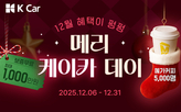 국내 최대 직영중고차 플랫폼 기업 K Car(케이카)가 연말 맞이 이벤트 ‘메리 케이카 데이’를 12월 한달간 열고, 다양한 혜택과 경품을 증정하는 행사를 진행한다고 8일 밝혔다. 먼저 겨울철 차량 문제에 대한 우려를 낮추기 위해 기획전 차량을 구매하는 고객 대상으로 품질 보증 연장 서비스 ‘케이카 워런티(KW)’를 무상 제공한다. ‘KW6 무료기획전’ 차량 구매자는 180일 동안 최대 1,000만원 보증수리 혜택을, ‘KW3 무료기획전’ 차량 구매자는 90일 동안 최대 500만원의 보증수리 혜택을 제공한다. 매주 화요일 오전 10시에 열리는 ‘위클리 특가’ 기획전에서는 최대 400만원의 할인을 제공하며, 신규 등록 차량을 배송비 없이 구매할 수 있는 ‘홈서비스 타임딜’ 대상 차량도 확대해 운영할 계획이다. ‘K Car 렌트’ 기획전을 통해 차량을 계약하는 고객에게 ‘주유권 10만원’을 증정한다. 또한 누구나 참여 가능한 고객 감사 이벤트도 진행된다. 케이카 어플리케이션 내 ‘마이카’에 보유 차량을 등록하고 혜택 수신에 동의하면 추첨을 통해 5,000명에게 메가커피 ‘HOT 아메리카노’ 쿠폰이 제공된다. 이번 ‘메리 케이카 데이’ 이벤트에 대한 자세한 내용은