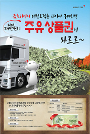 금호타이어(대표: 김창규)는 대형트럭용 타이어 구매 고객을 대상으로 주유상품권 증정 이벤트를 실시한다고 22일 밝혔다.전국의 금호타이어 트럭버스 서비스(KTS) 매장 및 행사 대리점에서 12R 22.5, 385/65R 22.5 두 개 규격의 행사 제품 구매 고객에게 주유상품권을 제공한다. 행사 제품은 12R 22.5 규격의 8개 제품(RA50, RS55, RD50, RD16, MA21, MD21, RA33, WA01) 및 385/65R 22.5 규격에 해당하는 전 제품이며, 행사제품 2개 이상 구매 시 2본당 SK주유상품권(1만원권) 4매를 현장에서 증정한다이번 행사 제품에는 고강도 24PR을 적용하고 내구성을 강화한 대형덤프용 제품 KRA50 (385/65R 22.5)을 비롯, 대형카고 전륜용 프리미엄 신제품 KRS55 (12R22.5) 및 15톤 덤프용 KMA21 (12R22.5) 등의 2014년 신제품이 포함되어 있다. 해당 이벤트는 11월 22일까지 진행되며, 이벤트에 관한 자세한 내용은 금호타이어 홈페이지(www.kumhotire.co.kr) 또는 대리점 문의를 통해 확인할 수 있다.이 밖에도 금호타이어는 10월 22일부터 24일까지 3일 간, 전국