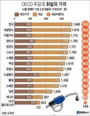 국내 주유소에서 판매되는 휘발유 가격은 세금이 붙기 전 리터(ℓ) 당 500원 수준으로 같은 양의 생수 가격 밑으로 떨어졌다.그러나 유류세 등 세금이 원래 가격의 2배 가량이 붙어 최종 소비자 가격은 1천400원이 넘는 것으로 나타났다.16일 오피넷 등에 따르면 올해 12월 평균 휘발유 제품의 세전 주유소 판매가격은 ℓ당 522.03원으로 집계됐다. 세전 주유소 판매가격은 국제 휘발유 제품 가격에 정유사와 주유소의 비용 등을 더한 가격을 말한다.12월 세전 주유소 판매가격은 1년 전인 지난해 12월(712.57원) 대비 27%, 2년 전인 2013년 12월(909.71원) 대비 44% 떨어진 수준이다.대형마트에서 생수 500ml 1병이 350∼400원에 판매된다는 것을 감안하면 1ℓ 기준으로 휘발유가 생수보다 더 싼 셈이다.그러나 이는 어디까지나 휘발유에 각종 세금이 붙기 전 상황이다.세전 휘발유 가격은 ℓ당 522.03원에 불과하지만 여기에 유류세 745.89원과 수입부과금 16원, 관세 8.3원, 부가가치세 143.58원 등 모두 913.77원에 달하는 각종 세금이 붙는다.결국 소비자들은 주유소에서 평균 ℓ당 1,435.80원에 휘발유를 구매하게 된다.