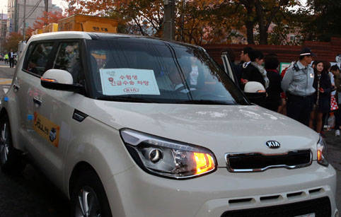 사진은 기아차 직원이 신형 쏘울로 수험생을 경기도 광명시 소재 광문고등학교까지 이동시켜 주고 있는 모습.