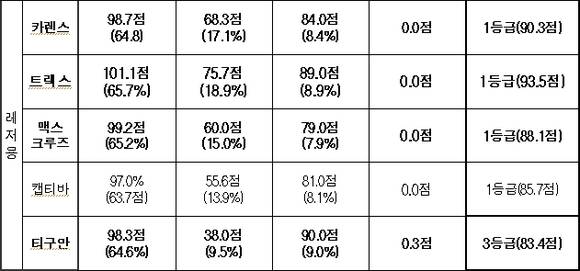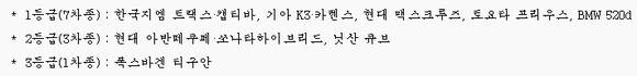 현대 아반떼쿠페와 쏘나타 하이브리드, 닛산 큐브 등 3개 차종은 2등급으로 분류됐다.