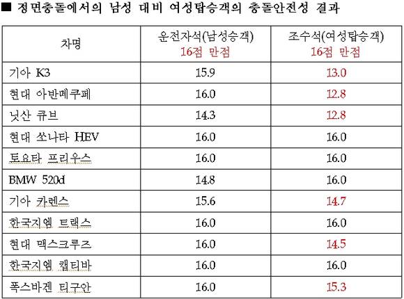 올해는 처음으로 여성인체 모형을 실어 충돌안전성을 평가한 결과 아반떼쿠페, 맥스크루즈, K3, 카렌스 등 일부 자동차는 남성인체 모형보다 상해 정도가 평균 10% 정도 높은 것으로 분석돼 여성과 어린이 등을 배려한 자동차 제작이 필요한 것으로 나타났다.