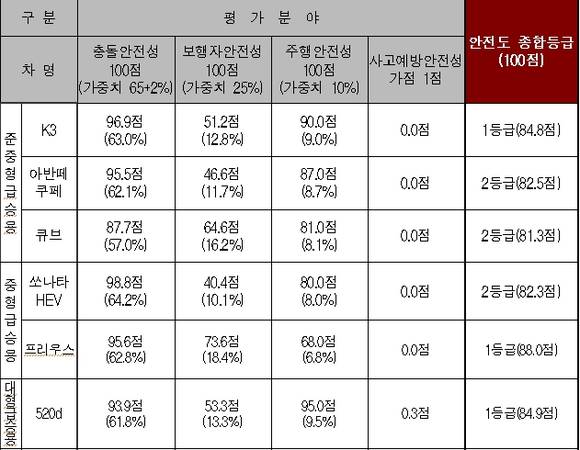 충돌·보행자·주행·사고예방 안전성 등 4개 분야 종합평가에서 이들 3개 차종을 포함해 7개 차종이 1등급을 받았다. 나머지 1등급 차종은 한국GM 캡티바, 기아 K3, 토요타 프리우스, BMW 520d 등이다.