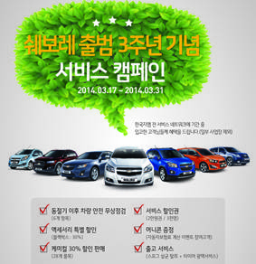 한국지엠은 ‘쉐보레 출범 3주년 기념 서비스 캠페인’을 3월 17일부터 31일까지 전국 437개서비스 네트워크에서 실시한다고 밝혔다.