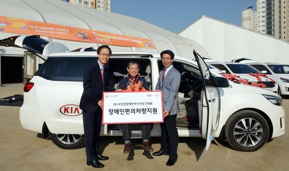 기아자동차는 10일 인천 구월 아시아드 선수촌 승하차장에서 경기 조직위원회 최승권 지원본부장, 기아자동차 최창묵 CSR경영팀 부장, 에이블복지재단 백종환 상임이사 등 대회 관계자들이 참석한 가운데 ‘2014인천장애인아시아경기대회’에서 사용될 장애인 편의차량 전달식을 가졌다.
