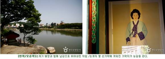 진주성 내에는 촉석루뿐 아니라 논개를 모신 사당인 의기사와 논개가 왜장과 함께 남강으로 뛰어내린 의암이 있다. 의기사에는 논개의 영정이 걸려 있는데, 단아하고 고고한 옛 여인이 열 손가락 위로 쌍가락지를 낀 모습에 오래도록 눈길이 간다.