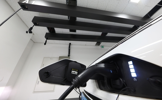 K-전기차 충전 시스템은 자동차 수는 늘고 있지만 주차 공간은 부족한 국내 주거환경 특성을 반영해 공유형 충전기와 케이블을 천장에 둔 것이 특징이다.