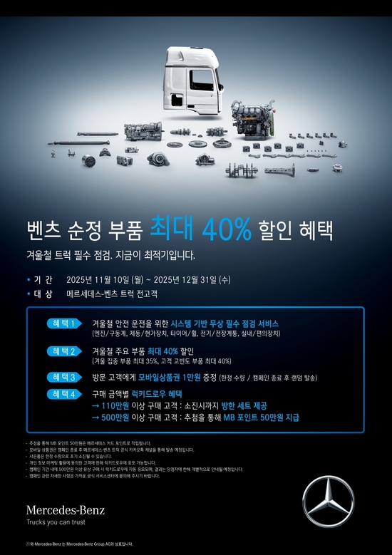 메르세데스-벤츠 트럭 공식 수입사 스타트럭코리아(대표이사 동근태)가 겨울철 안전 운행을 위한 ‘메르세데스-벤츠 트럭 겨울맞이 서비스 캠페인’을 12월 31일까지 실시한다.
