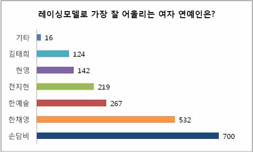 설문조사 결과 레이싱모델로 가장 잘 어울릴 것 같은 여자연예인은 가수 손담비, 남자연예인은 탤런트 이세창이 각각 1위에 선정됐다. 국내 최대 튜닝 전시회 ‘2009 서울오토살롱’은 7월 2일 개막을 앞 둔 가운데 자동차생활 포털 엔크린닷컴(www.enclean.com) 회원 2,000명을 대상으로 공동설문조사를 실시한 결과, 레이싱 모델로 가장 잘 어울리는 연예인으로 손담비(35%)가 뽑힌 것으로 나타났다. 설문 결과에 따르면 "레이싱모델로 가장 잘 어울리는 여자 연예인"으로 ▲가수 손담비가 35%(700명)로 1위를 차지했다. ▶가장 어울리는 레이싱모델 손담비 한채영 한예슬 順 그 뒤로, ▲탤런트 한채영이 27%(532명)로 2위를 차지했으며, ▲한예슬 13%(267명), ▲전지현 11%(219명), ▲현영 7%(142명), ▲김태희 6%(124명), 기타 1%(16명) 순으로 나타났다. "미쳤어"에 이어 "토요일 밤에"를 연속 히트시키며 최고의 인기를 얻고 있는 섹시 가수 손담비는 168cm, 45kg의 늘씬한 몸매를 자랑하고 있다. 뿐만 아니라 도도하고 세련된 마스크를 가지고 있어 레이싱모델로 가장 잘 어울리는 연예인 1위에 뽑힌 것으로 보여진다. 2위를 차지한 한채영 역시 이국적인 외모와 바비 인형을 연상케하는 완벽한 몸매로 레이싱모델로 손색이 없다는 평가다. |