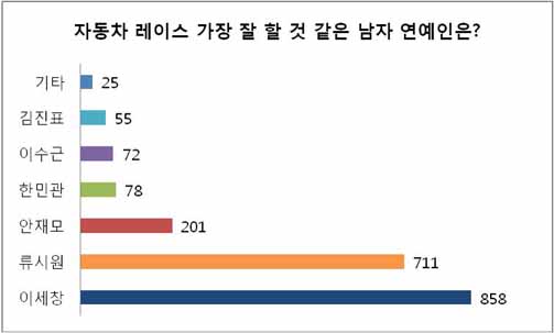 "자동차 레이스 가장 잘 할 것 같은 남자 연예인"으로는 이세창이 43%(858명)로 1위에 선정됐으며, ▲류시원이 35%(711명)로 2위를 차지했다. 그 뒤를 이어 ▲안재모가 10%(201명), ▲한민관 4%(78명), ▲이수근 4%(72명), ▲김진표 3%(55명), 기타 1%(25명) 순으로 나타났다. "자동차 매니아"로도 잘 알려져 있는 이세창과 류시원은 레이싱 소속팀에서 레이싱 시합에 출전하는 등 빡빡한 스케줄에도 불구하고 레이싱 스포츠에 대한 강한 애정을 갖고 있는 것을 알려져 있다. |
